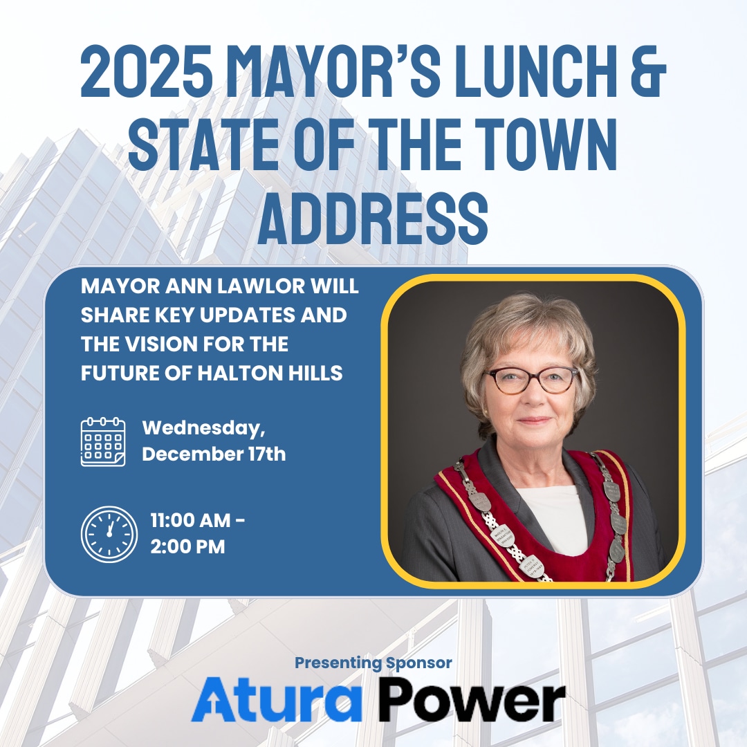 Join us for the annual Mayor's State of the Town Address, where Her Worship Mayor Ann Lawlor will share key updates and the vision for the future of Halton Hills. This highly anticipated event will cover accomplishments, challenges, and priorities shaping our vibrant community. It's a unique opportunity to engage with local leaders, learn about upcoming projects, and celebrate the spirit of Halton Hills.