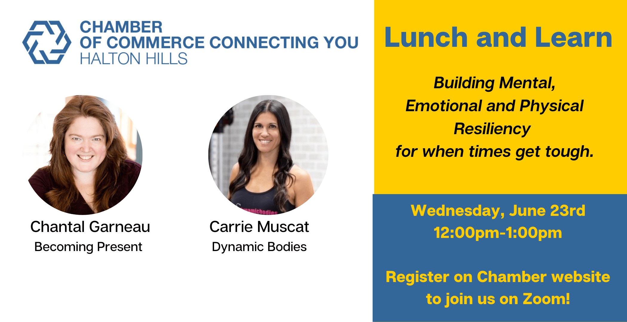 Join Carrie Muscat from Dynamic Bodies and Chantal Garneau from Becoming Present for some concrete strategies on staying physically, emotionally and mentally resilient during uncertain times.